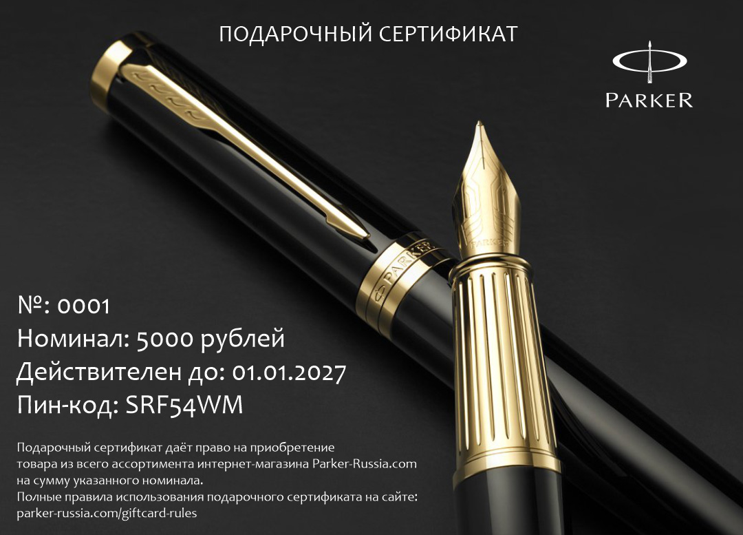 Подарочный сертификат Parker 5000 от официального дилера Parker в Рязани. Вы можете дополнительно заказать гравировку, которая подчеркнет Вашу оригинальность и придаст памятность статусному подарку. Все ручки Паркер поставляются в фирменном футляре.
